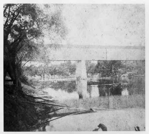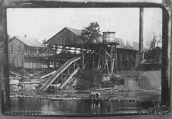 Log boom at the Ellaville Mill with the covered bridge in the background.